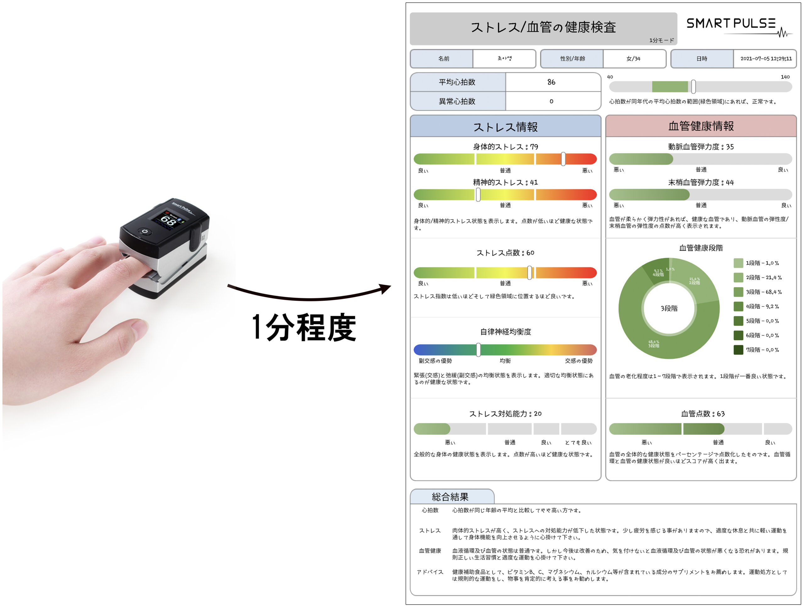 スマートパルスに指を1分程度挿入するだけで健康度の測定ができます。